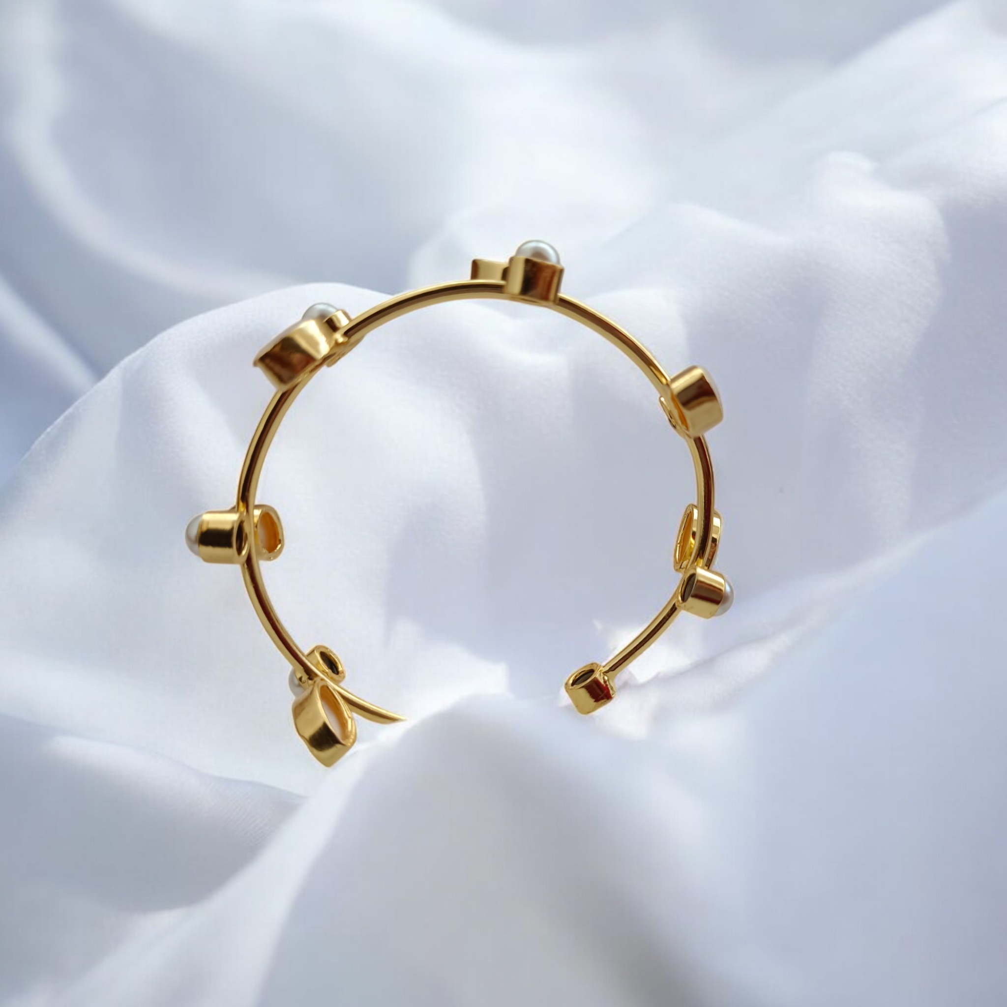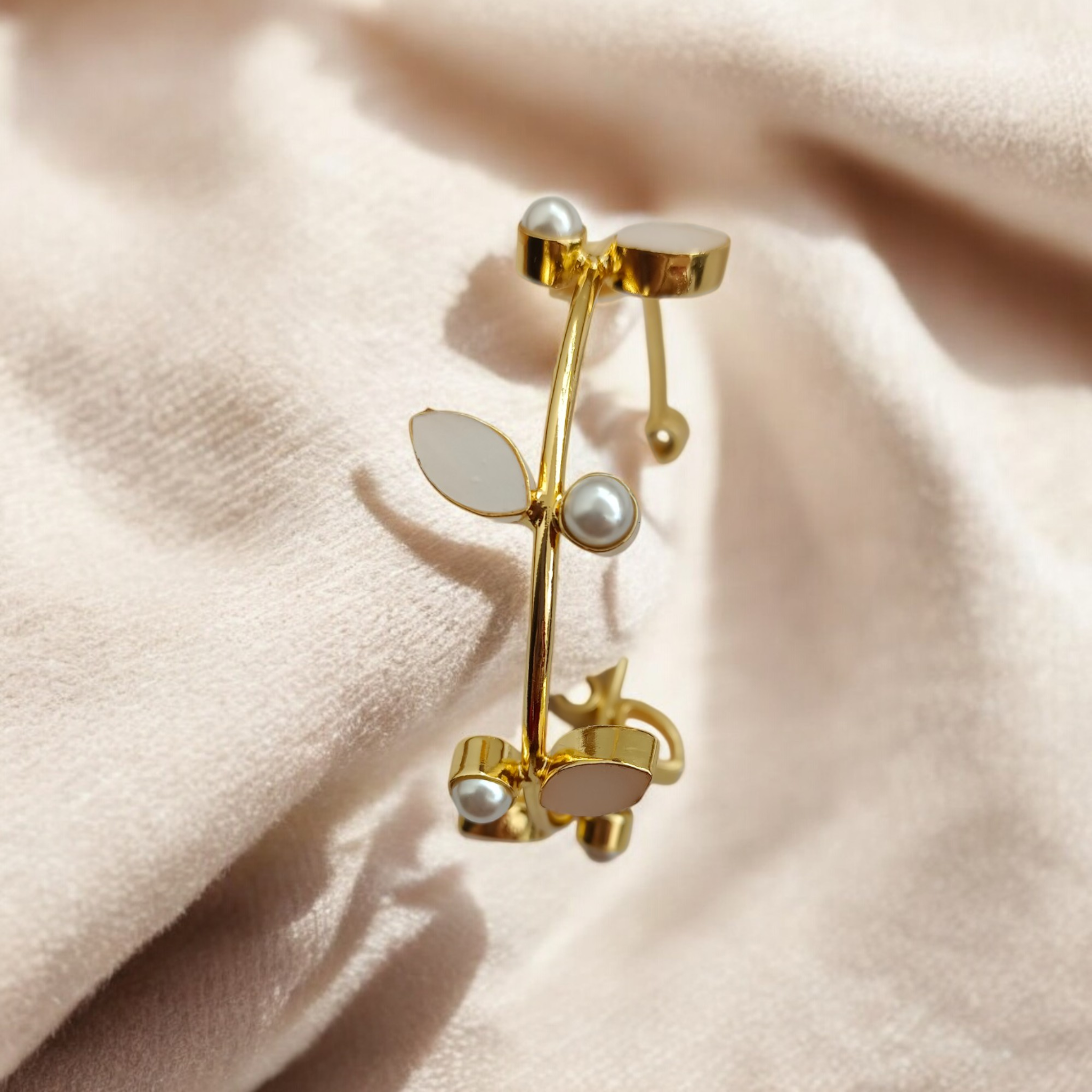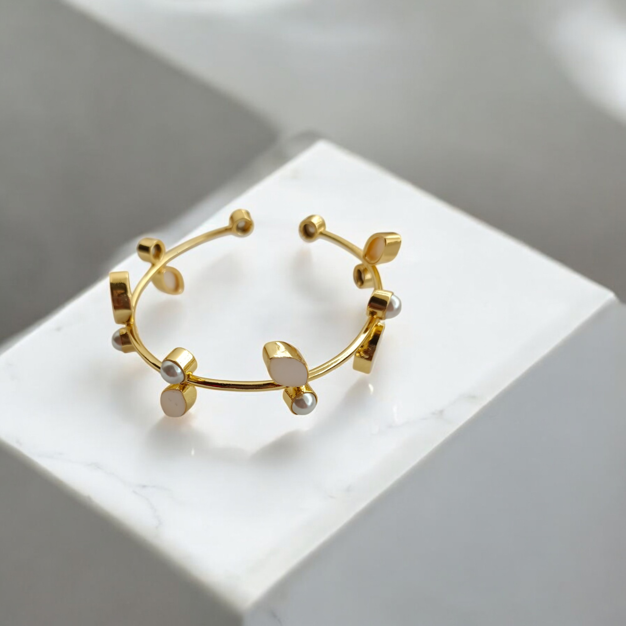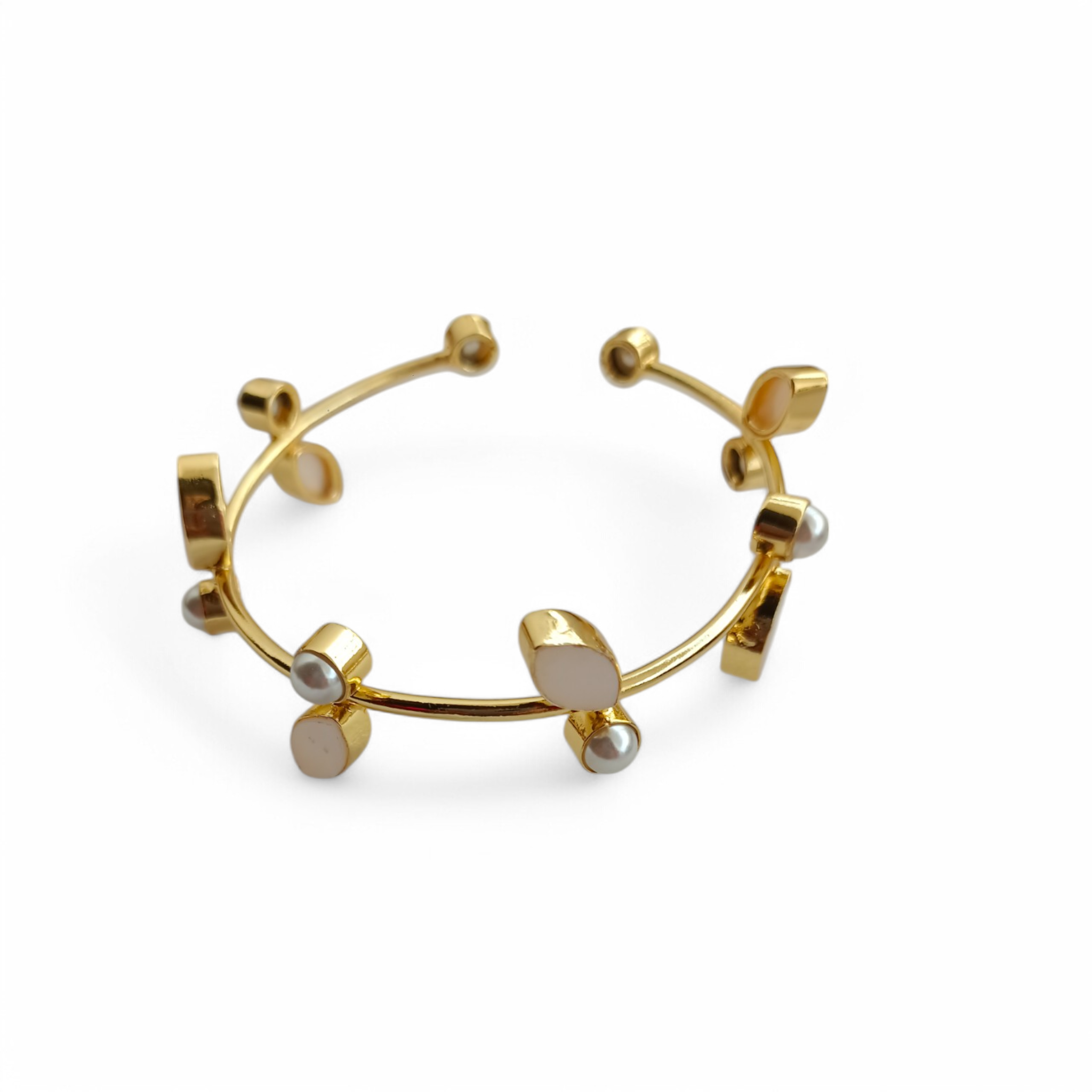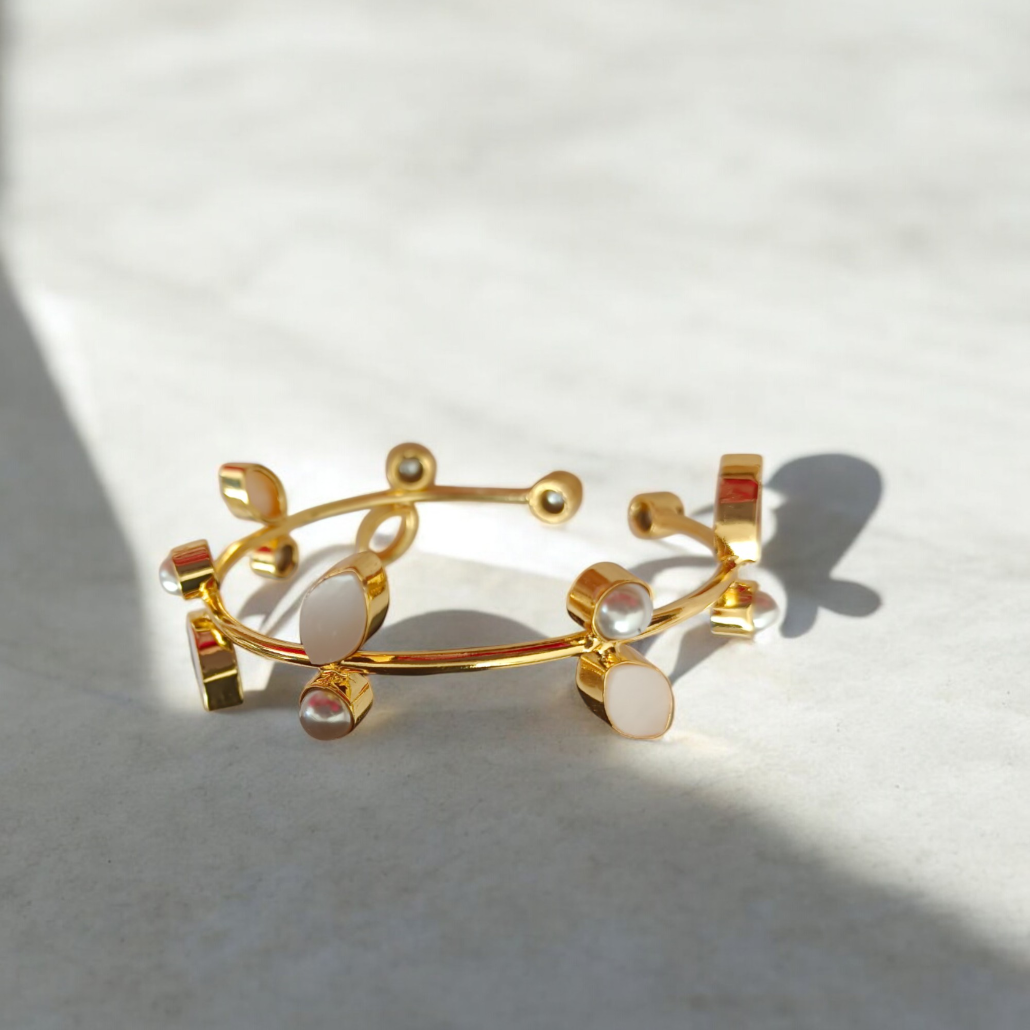Radiating cosmic elegance, the Celestial Orbit MOP & Pearl Brass Cuff is a statement of modern grace with a timeless soul. Handcrafted in high-quality brass, this open cuff features alternating Mother of Pearl and lustrous freshwater pearls, each bezel-set to enhance their natural glow. The minimalist yet sculptural design reflects a celestial dance, making it perfect for both day and evening wear.