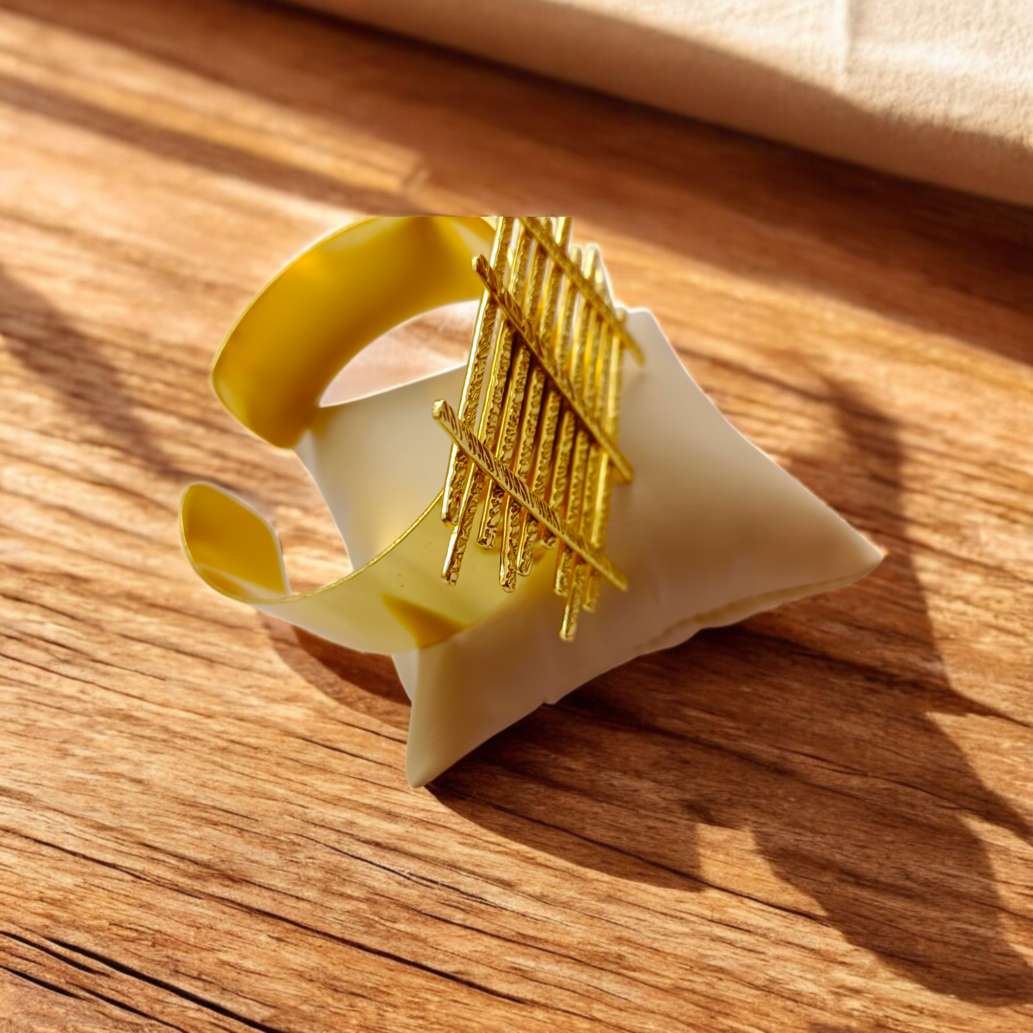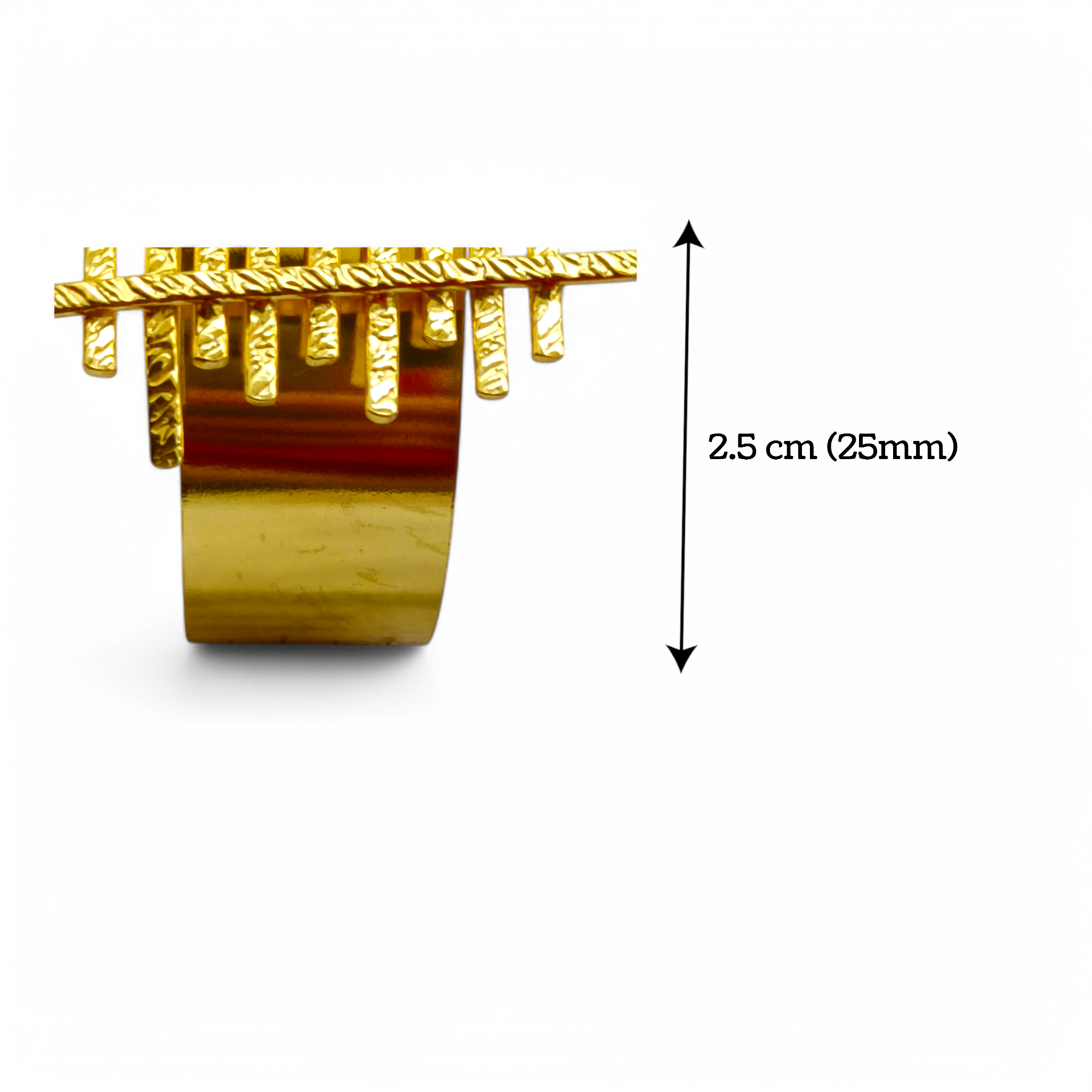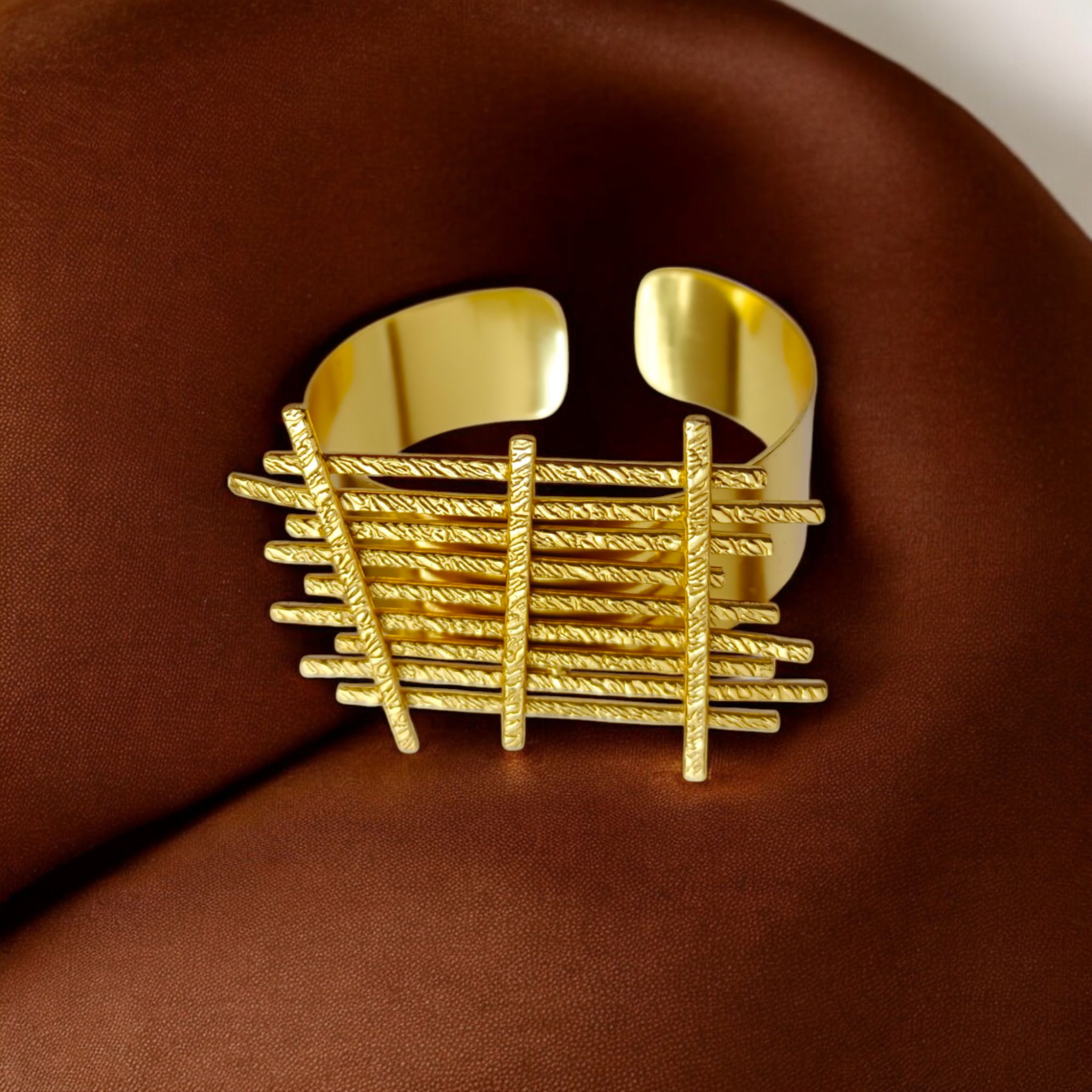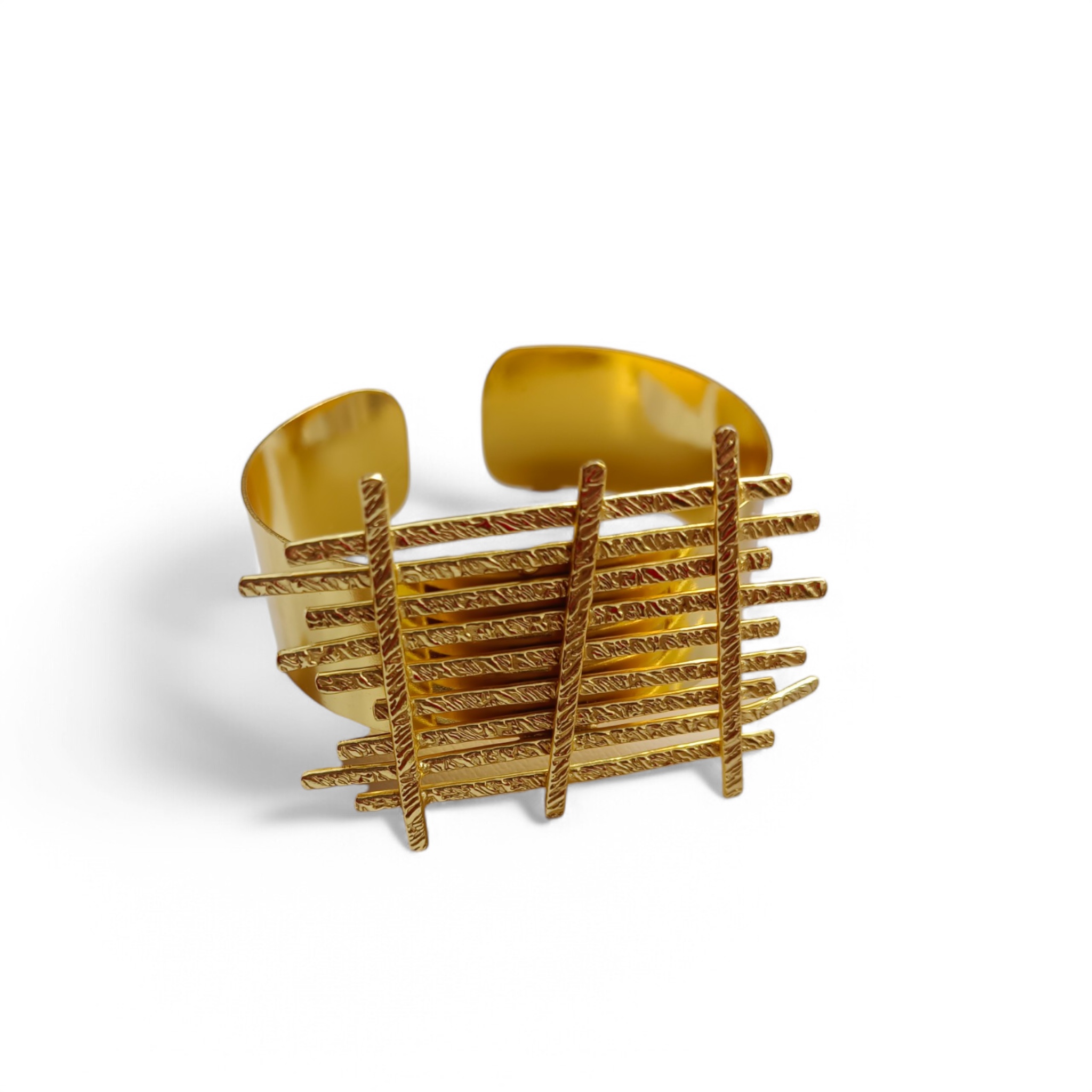 Make a bold yet refined statement with the Golden Lattice Textured Brass Cuff. This striking bracelet features a unique interwoven lattice design, each bar delicately textured to catch and reflect light from every angle. Crafted from high-quality brass and polished to a radiant gold finish, it merges geometric artistry with timeless elegance. Its open cuff style allows for easy wear and a comfortable, adjustable fit, making it perfect for both everyday wear and special occasions.