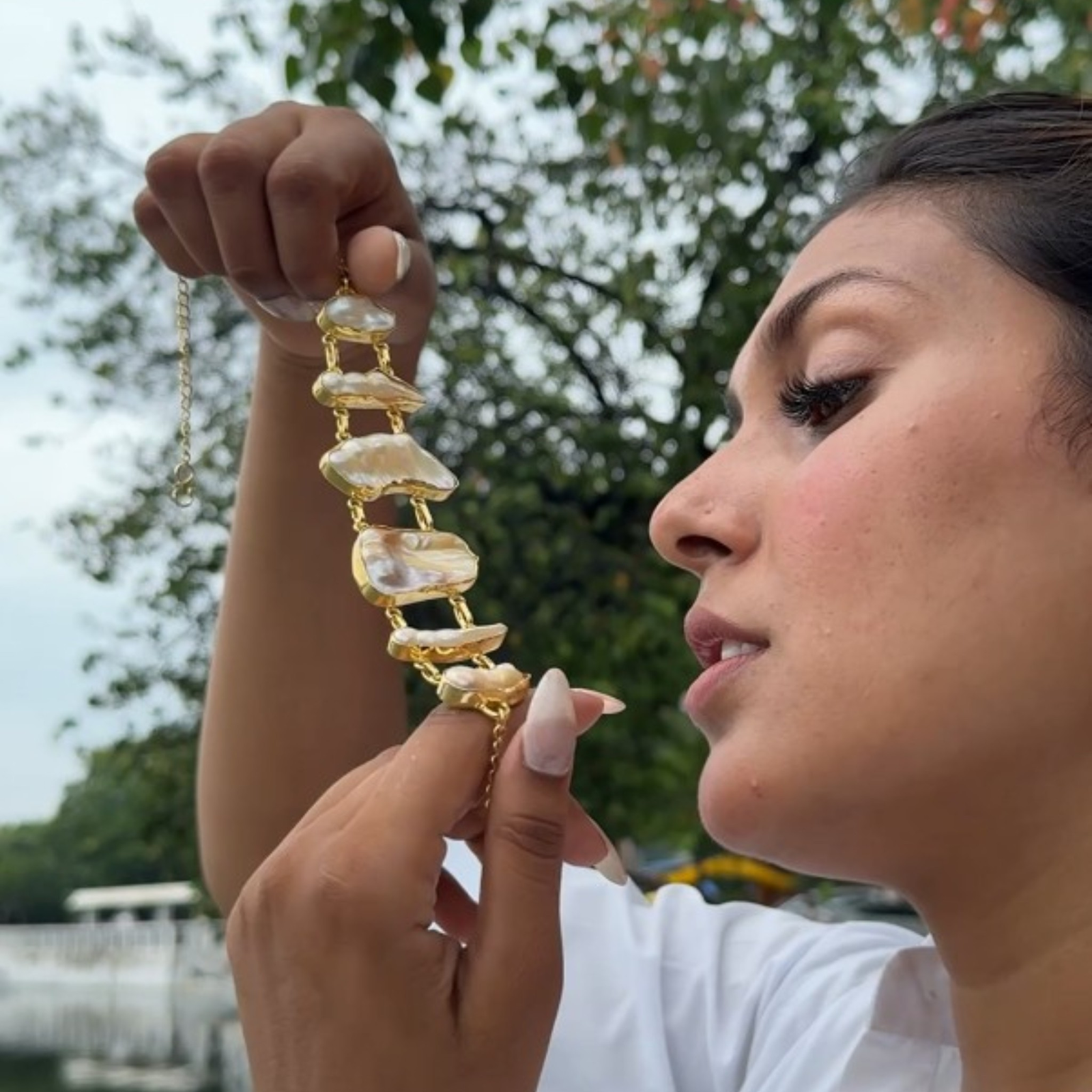 - Keep away from water to preserve the gold finish and pearl luster.