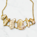 The soft iridescence of the pearls reflects gentle hues of cream, blush, and gold, while the organic, freeform design gives it an effortlessly sophisticated yet modern appeal. Lightweight and versatile, it drapes gracefully around the neckline, making it perfect for both statement dressing and subtle elegance.