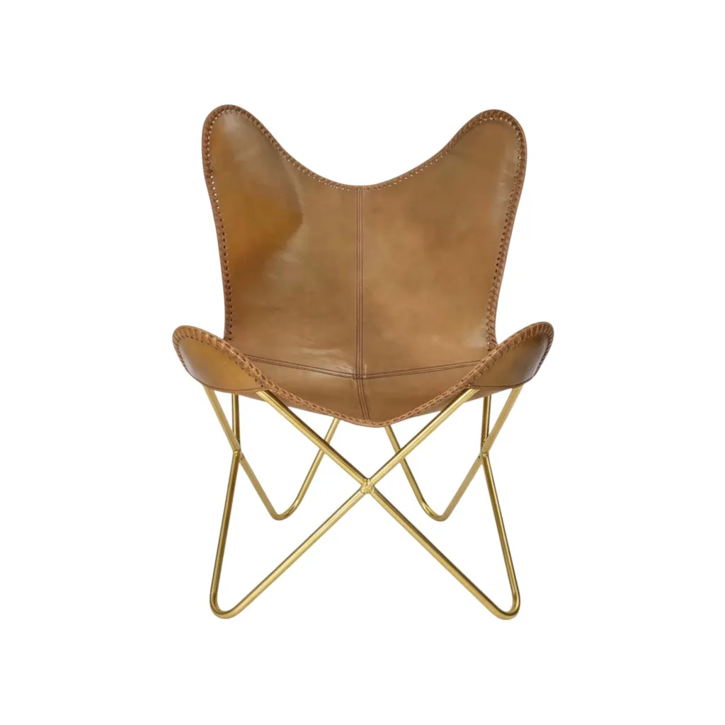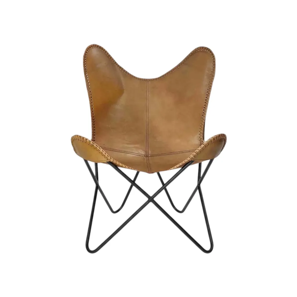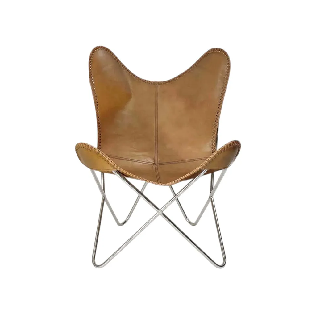 This Soft Leather Butterfly Chair is a stunning blend of timeless design and modern comfort, crafted to elevate any living space with its inviting aesthetic and ergonomic form. The chair’s frame is constructed with a sturdy, yet lightweight metal base, shaped into a sleek, wing-like silhouette that mimics the graceful spread of a butterfly’s wings. This iconic design is both visually striking and functional, offering a perfect balance of stability and flexibility. The seat and backrest are upholstered in sumptuous, light brown soft leather that exudes warmth and sophistication. The leather’s smooth texture and subtle sheen create an inviting tactile experience, while its rich, earthy tone adds a touch of natural elegance to any room. The leather is carefully stitched with precision, showcasing fine craftsmanship and attention to detail, ensuring durability and a luxurious feel.